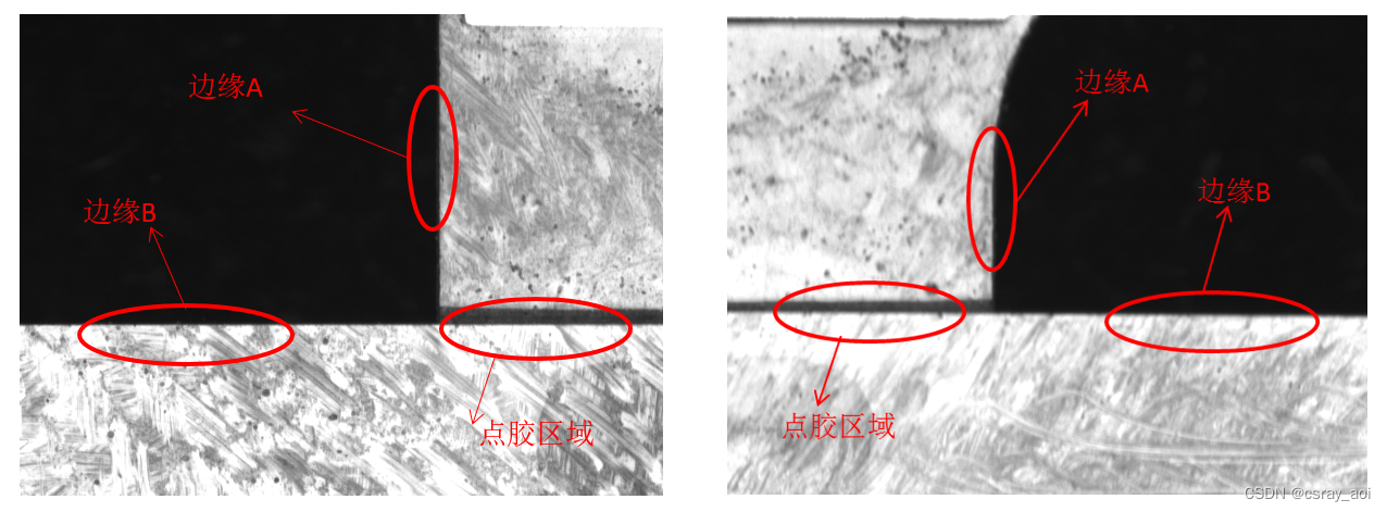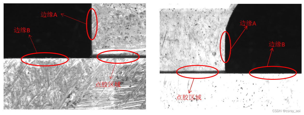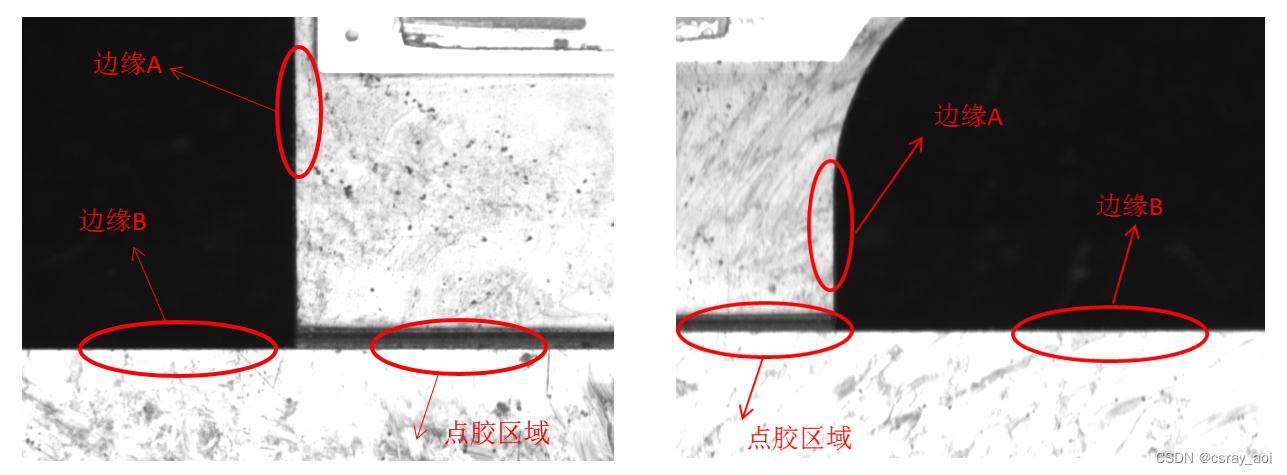 兩張圖片為一個(gè)產(chǎn)品點(diǎn)膠部位的左邊和右邊。通過(guò)邊緣A和邊緣B這兩條線可以找出交點(diǎn)位置做為定位點(diǎn)(產(chǎn)品不平會(huì)造成圖像模糊的情況)